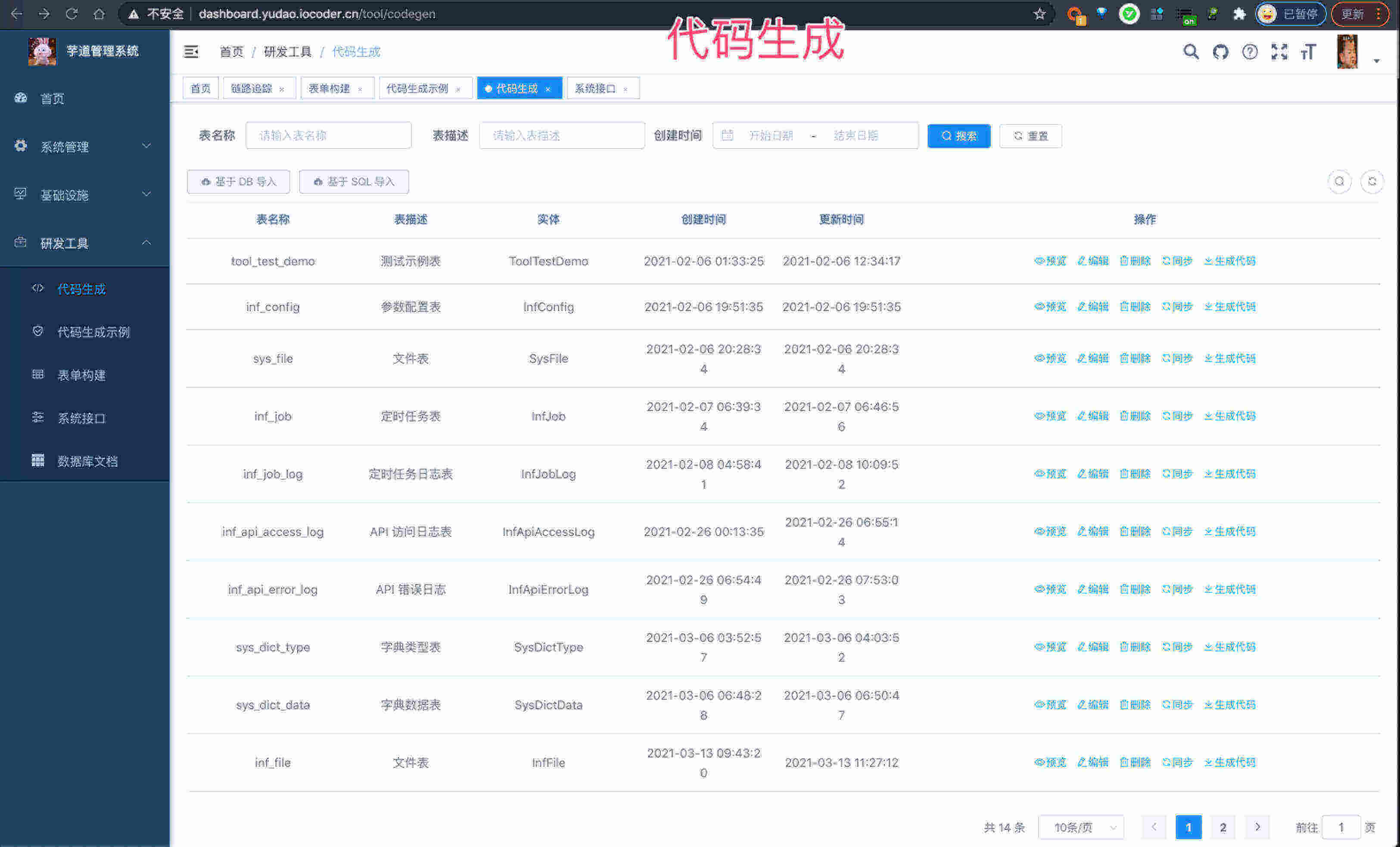 | 🚀 | 代码生成 | 前后端代码的生成(Java、Vue、SQL、单元测试),支持 CRUD 下载 |