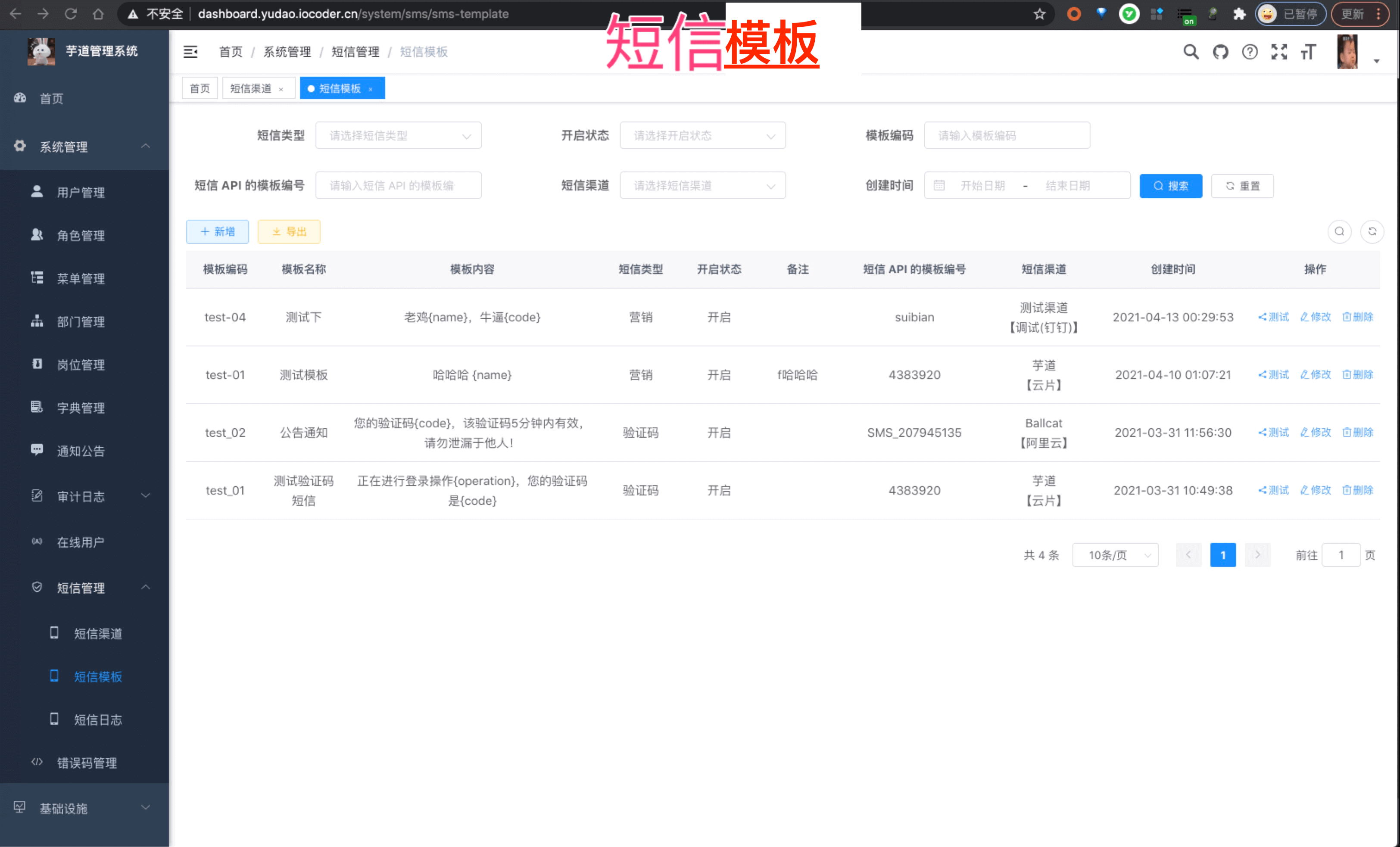 | 🚀 | 短信管理 | 短信渠道、短息模板、短信日志,对接阿里云、腾讯云等主流短信平台 |